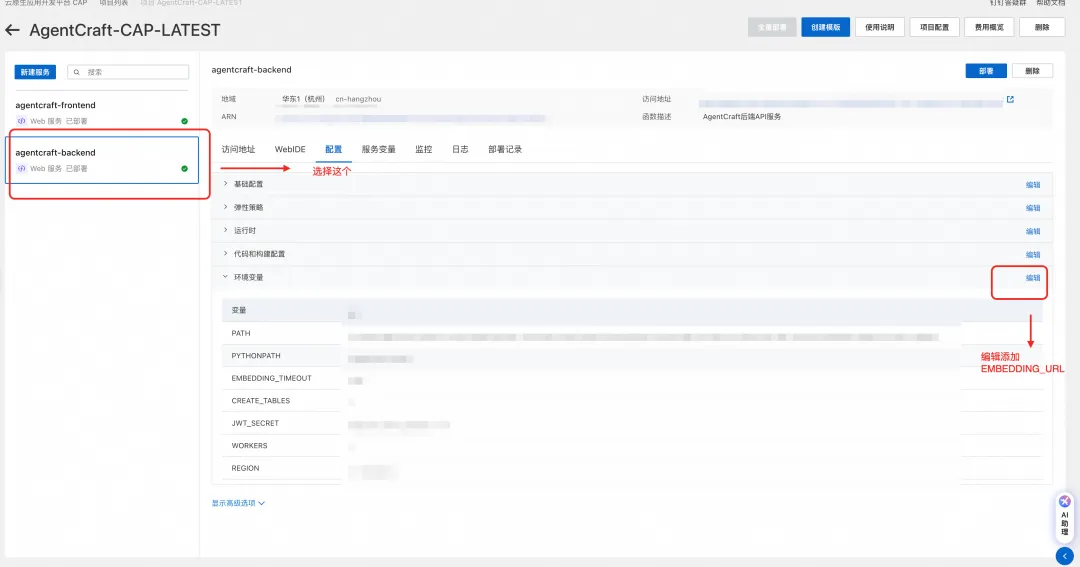然后进入刚部署的服务,选择 backend,环境变量,添加 EMBEDDING_URL=<复制的地址>/embedding。