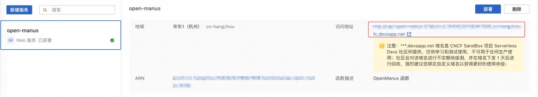 当前测试域名由 Serverless Devs 社区所提供,仅供学习和测试使用,不可用于任何生产使用,域名有效期为 1 天,如果需要用于生产环境建议配置自定义域名,详细配置方式请参考:为函数或应用绑定自定义域名_函数计算(FC)-阿里云帮助中心。