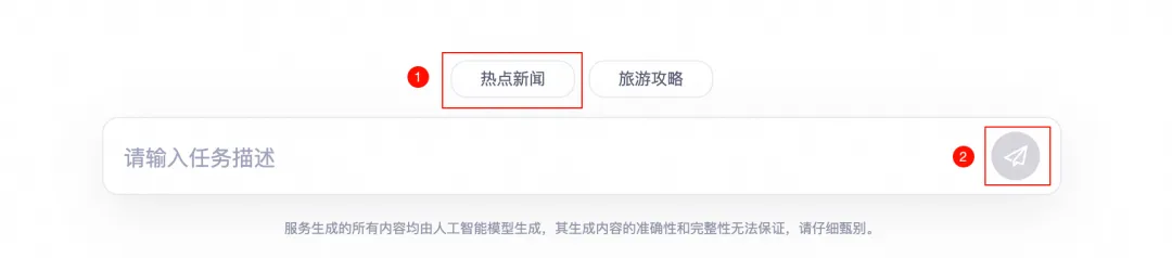 - 按如下图所示,使用示例单击热点新闻,让 AI 自动搜集整理今天 AI 相关的热点新闻,然后单击发送。