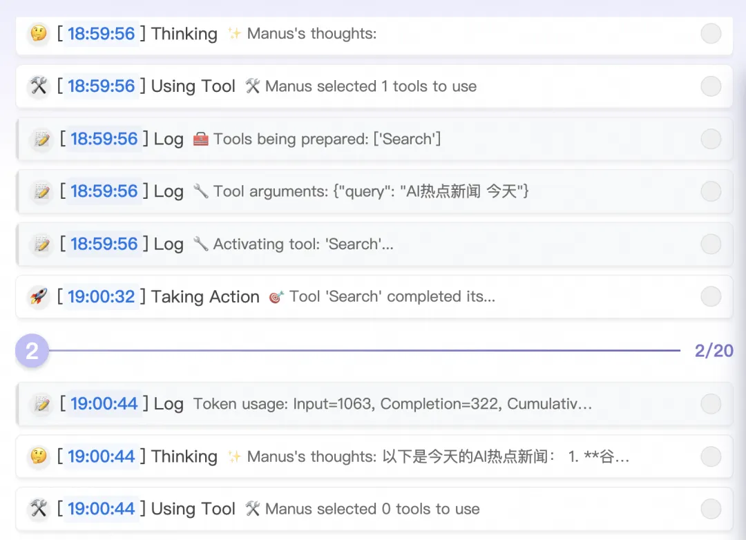 OpenManus 无需注册或密钥验证,支持本地部署,其实时反馈机制将任务执行的每一步实时呈现给用户,任务执行进度实时可视化,杜绝" AI 黑箱"焦虑。