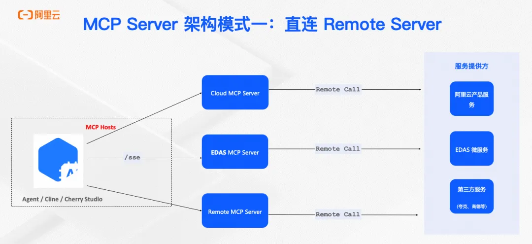 这种架构就像你直接打电话给专家咨询问题 —— MCP Client 通过 SSE 方式直接连接到远程 MCP Server,全程保持 HTTP 长连接。