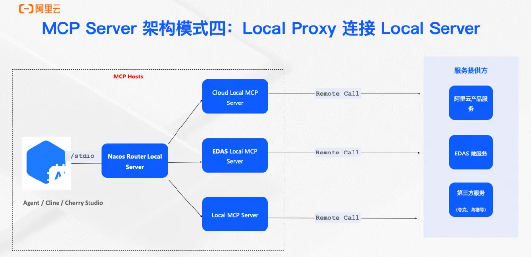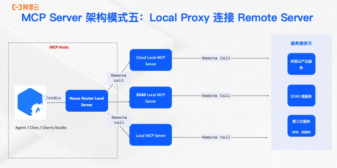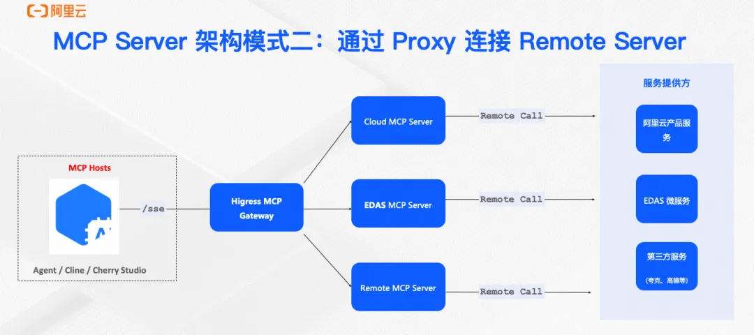 这种架构就像有个翻译在中间帮你沟通 —— MCP Client 先连接到 Proxy Server,再由 Proxy 转接到 Remote Server。