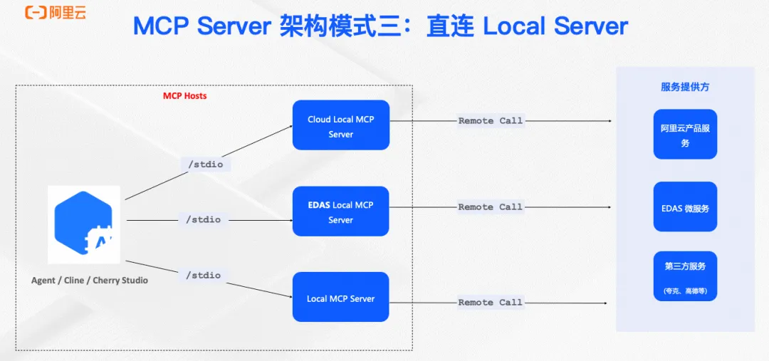这种架构就像你家里有个私人助理 —— MCP Client 通过 STDIO 方式直接连接本地 MCP Server,进程间直接通信。
