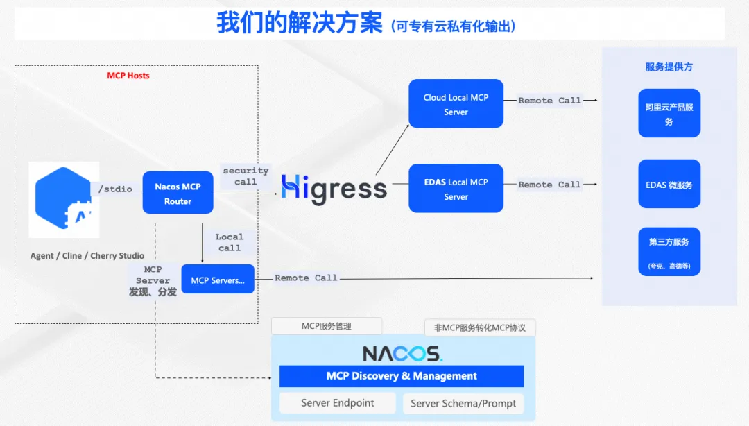 MCP 目前默认成为了 AI 大模型与存量业务数据互通的管道,但由于目前的 MCP 协议本身从设计上未太多考虑企业级落地的情况,导致很多的企业还处在观望的状态。MCP 要想完整落地,中心化的注册中心、可控的软件供应链、安全的访问控制这三方面的建设必不可少。在我们的方案中,主要通过 Nacos 作为 MCP 的未来企业 MCP 的注册中心,通过 Nacos Server 对 MCP 服务器的管理能力,结合 Nacos Router 做到软件供应链的精准控制;同时配合 Higress 做到 MCP 的安全访问,以此给我们的企业级客户带来 MCP 完整的解决方案。