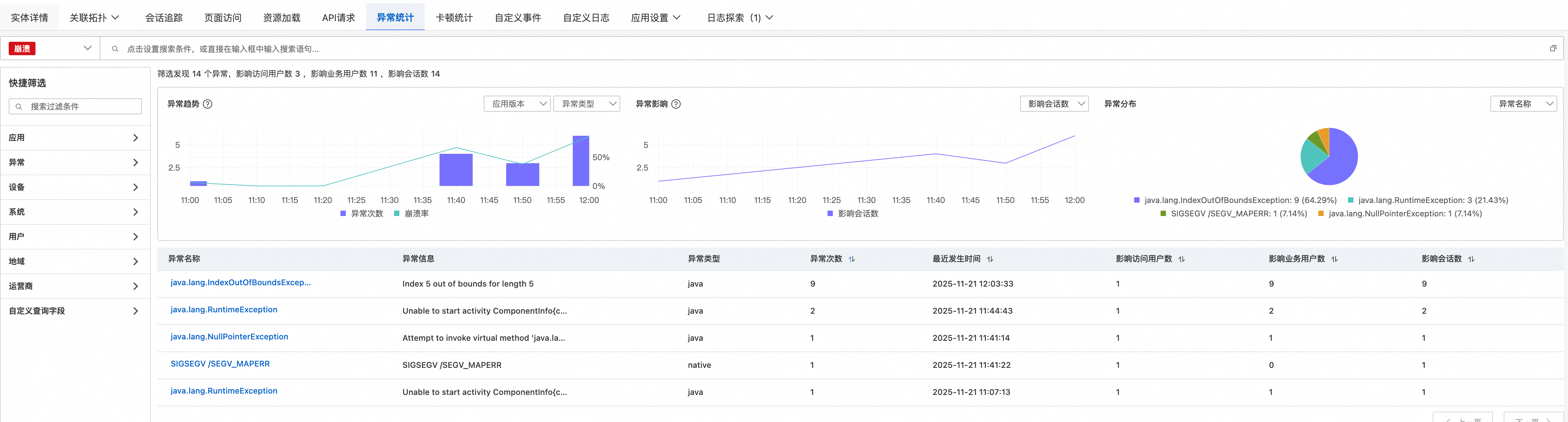 操作路径:控制台首页 → 用户体验监控 → 找到对应的 App 应用 → 异常统计。