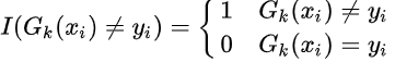 \(e_{k} = P(G_{k}(x_{i} \neq y_{i}) = \sum_{i=1}^m w_{ki} I(G_{k}(x_{i} \neq y_{i})\)