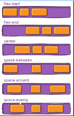 justify-content:center (居中) justify-content:flex-start | flex-end | space-between | space-around | space-evenly