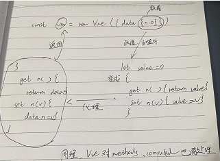 简单说就是用户更改数据(Data)时,视图可以自动刷新,页面UI能够响应数据变化。 Vue就是通过getter 和setter来对数据进行操作,通过get()和set()函数可以生成一个虚拟属性,来直接调用函数操作数据。 此外,还需要一个重要的API,那就是Object.defineProperty,因为对象被定义完成后,想要更改或添加属性(像是get和set这样的属性),只能通过这个Object.defineProperty来添加。接着需要实现对数据属性的读写进行监控。能够监控就意味着能让vm(一般生成的实例)能够知道数据有变化,从而触发render(data)函数,页面UI就会做出响应。