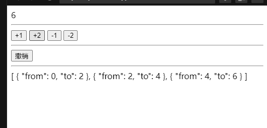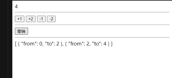 Vue.config.productionTip = false; new Vue({ data: { n: 0, history: [], inUndoMode: false }, watch: { n: function(newValue, oldValue) { console.log(this.inUndoMode); if (!this.inUndoMode) { this.history.push({ from: oldValue, to: newValue }); } } }, // 不如用 computed 来计算 displayName template: ` <div> {{n}} <hr /> <button @click="add1">+1</button> <button @click="add2">+2</button> <button @click="minus1">-1</button> <button @click="minus2">-2</button> <hr/> <button @click="undo">撤销</button> <hr/> {{history}} </div> `, methods: { add1() { this.n += 1; }, add2() { this.n += 2; }, minus1() { this.n -= 1; }, minus2() { this.n -= 2; }, undo() { const last = this.history.pop(); this.inUndoMode = true; console.log("ha" + this.inUndoMode); const old = last.from; this.n = old; // watch n 的函数会异步调用 this.$nextTick(() => { this.inUndoMode = false; }); } } }).$mount("#app");
