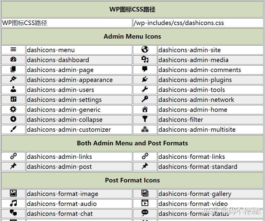 为了方便大家在wordpress主题开发中使用dashicons字体小图标,这里,我们把dashicons提供的所有字体小图标的class类及样子展示给大家。