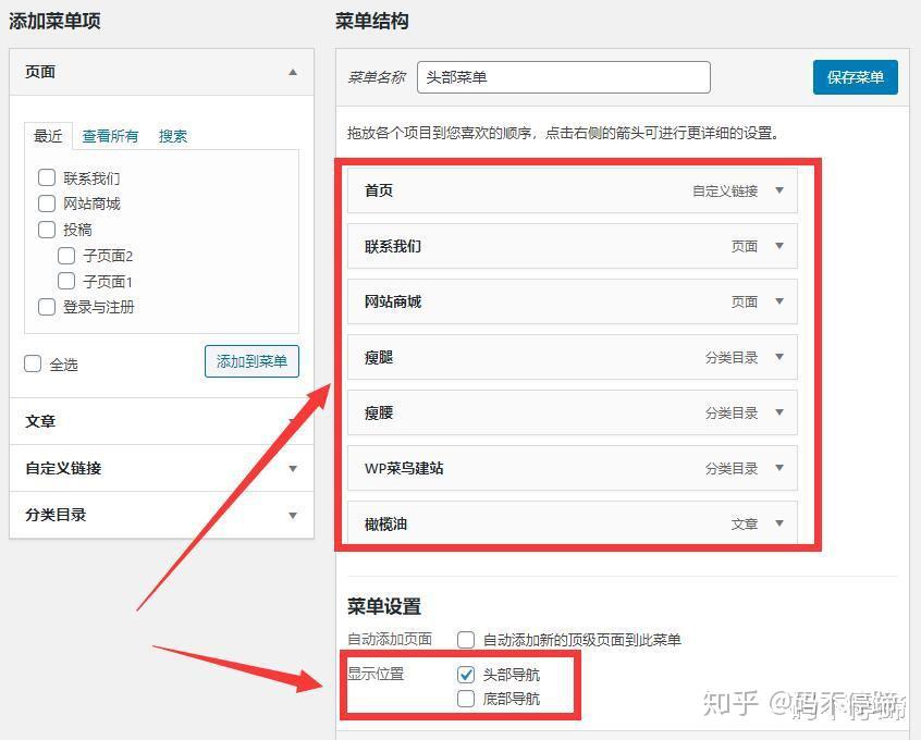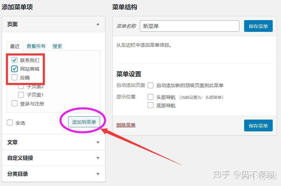在这个菜单结构界面,我们可以选择左侧的“添加菜单项”中的页面、分类目录、文章、自定义链接这几个选项中的子项,然后点击“添加到菜单”,就添加到右侧的菜单结构中,想在wordpress网站前台导航菜单中显示什么,就选择什么。如下图: