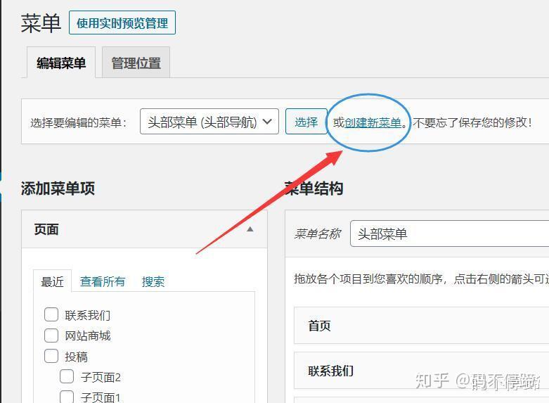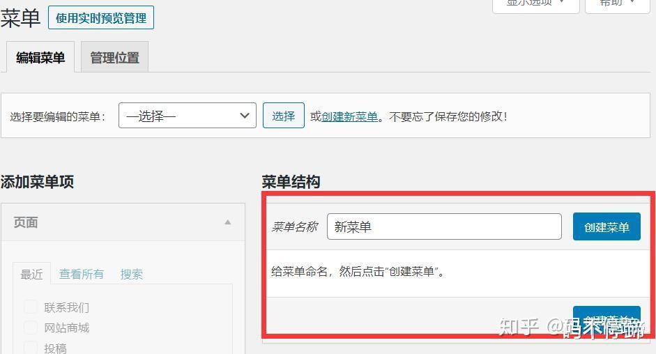 给wordpress网站后台添加了菜单功能后,我们就可以在wordpress后台的菜单中创建前台网页的自定义导航菜单了。点击“外观”中的“菜单”,右侧内容栏进入到菜单界面,如下图: