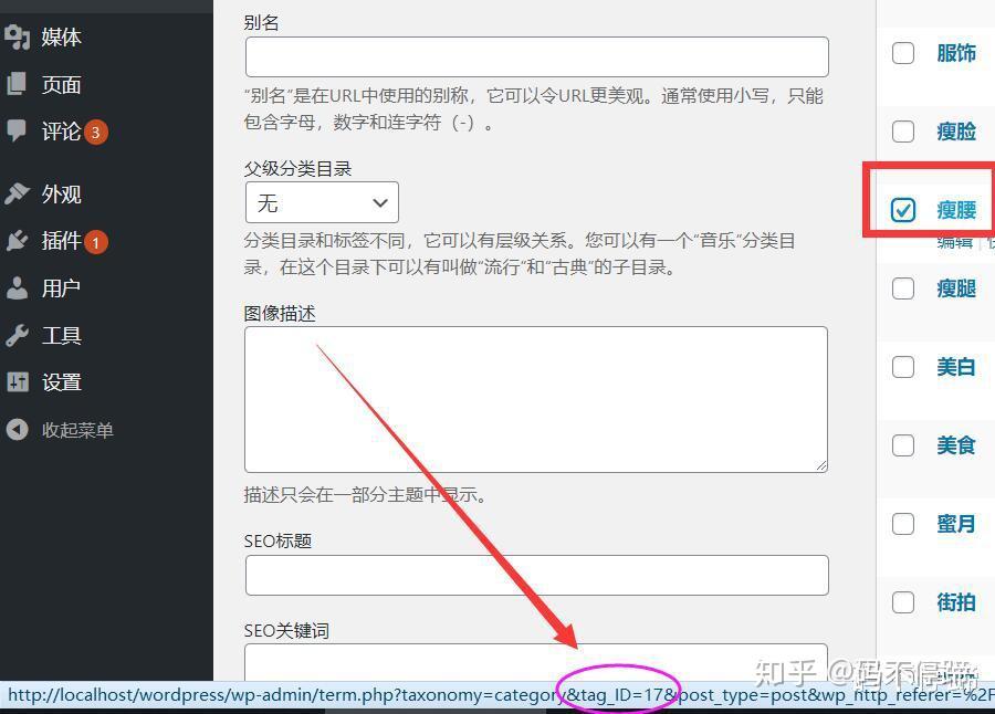 进入到wordpress网站后台的分类目录页面,把鼠标的指针移动到某个分类目录的名称上面,这时,在浏览器底部的状态栏中,就会出现这个分类的相关信息,里面就有这个分类的ID号,如下图圈圈中所标的就是分类ID号。通过这种方式我们获取多个分类的ID号,瘦腰分类的ID号是17,瘦腿分类的ID号是3。