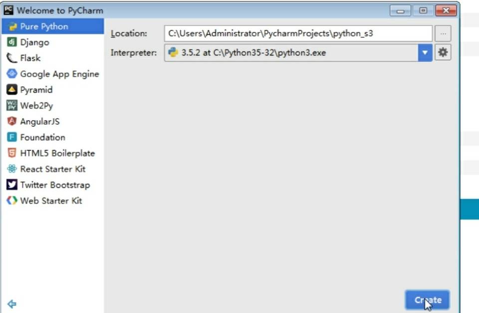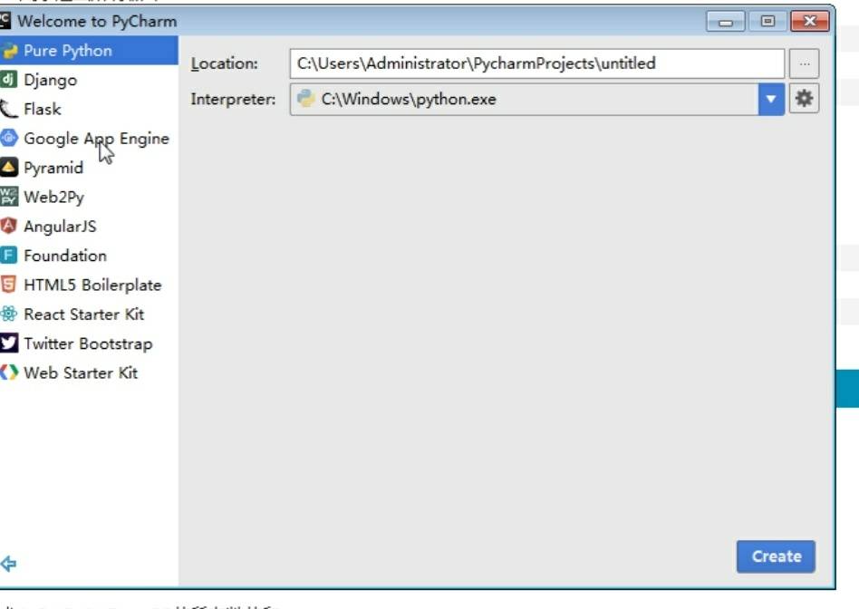 2.创建Pure Python,填写路径然后点击创建Create进行创建。