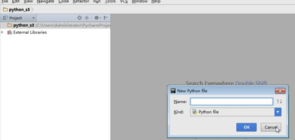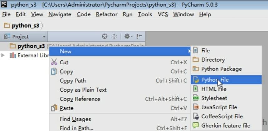 4.创建文件 同样右键点开创建的文件夹鼠标放在"New"上,再点击python file进行创建开始进行代码的编写。