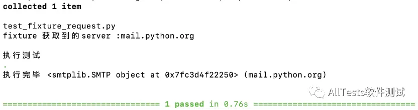 #!/usr/bin/env python # -*- coding: utf-8 -*- """ 微信公众号:AllTests软件测试 """ import pytest import smtplib @pytest.fixture(scope="module") def my_smtp(request): server = getattr(request.module, "smtpserver", "smtp.163.com") print("\nfixture 获取到的server :%s" %server) smtp = smtplib.SMTP(server, 587, timeout=5) yield smtp print("\n执行完毕 %s (%s)" % (smtp, server)) smtp.close() smtpserver = "mail.python.org" def test_smtp(my_smtp): print("\n执行测试")