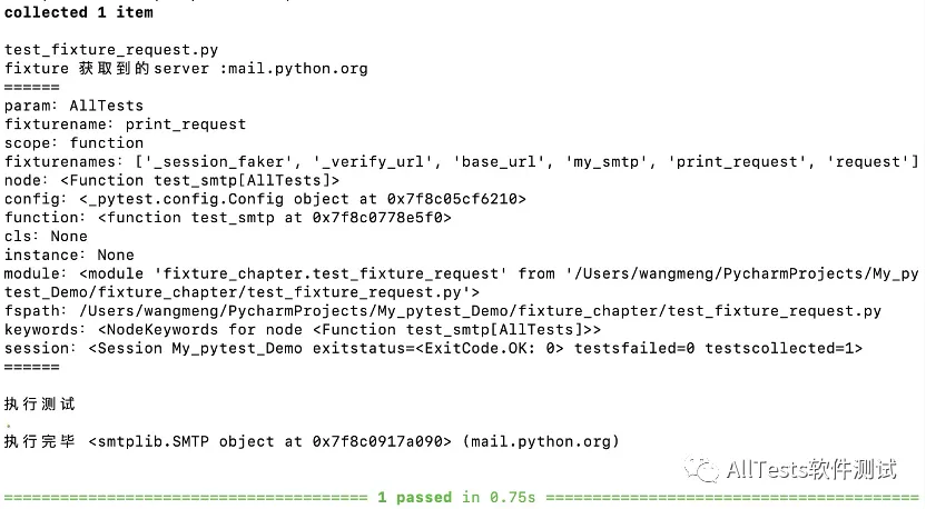 #!/usr/bin/env python # -*- coding: utf-8 -*- """ 微信公众号:AllTests软件测试 """ import pytest data = ["AllTests"] @pytest.fixture(params=data, autouse=True) def print_request(request): print("======") print("param:" + str(request.param)) print("fixturename:" + str(request.fixturename)) print("scope:" + str(request.scope)) print("fixturenames:" + str(request.fixturenames)) print("node:" + str(request.node)) print("config:" + str(request.config)) print("function:" + str(request.function)) print("cls:" + str(request.cls)) print("instance:" + str(request.instance)) print("module:" + str(request.module)) print("fspath:" + str(request.fspath)) print("keywords:" + str(request.keywords)) print("session:" + str(request.session)) print("======")