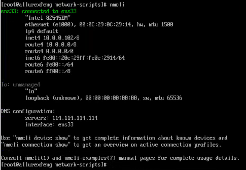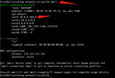 4、接着输入命令刷新网卡配置:nmcli c up ens33 #刷新后可以使用最新的IP地址。
