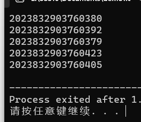 1 #include<stdio.h> 2 #include<stdlib.h> 3 #include<time.h> 4 5 #define N 5 6 #define N1 374 7 #define N2 465 8 9 int main() 10 { 11 int number; 12 int i; 13 14 srand(time(0)); 15 16 for(i=0;i<N;++i) 17 { 18 number=rand()%(N2-N1+1)+N1; 19 printf("202383290376%04d\n",number); 20 } 21 return 0; 22 }