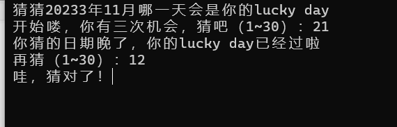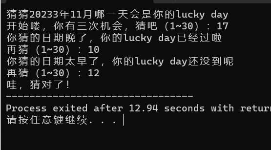1 #include<stdio.h> 2 #include<stdlib.h> 3 4 #define D1 1 5 #define D2 30 6 7 int main() 8 { 9 int day; 10 int i; 11 int c=0; 12 int a=1; 13 printf("猜猜20233年11月哪一天会是你的lucky day\n"); 14 printf("开始喽,你有三次机会,猜吧(1~30):"); 15 16 day = rand()%(D2-D1+1)+D1; 17 for(c=3;c>0;c--) 18 { 19 a=i-1; 20 scanf("%d",&i); 21 if(i<day) 22 { 23 printf("你猜的日期太早了,你的lucky day还没到呢\n"); 24 printf("再猜(1~30):"); 25 } 26 else if(i>day) 27 { 28 printf("你猜的日期晚了,你的lucky day已经过啦\n"); 29 printf("再猜(1~30):"); 30 } 31 else if(i==day) 32 printf("哇,猜对了!"); 33 } 34 return 0; 35 }