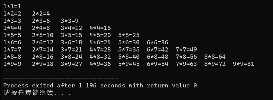 1 #include<stdio.h> 2 3 int main() 4 { 5 int i,j; 6 for(i=1;i<=9;i++) 7 { 8 for(j=1;j<=i;j++) 9 { 10 printf("%d*%d=%-3d ",j,i,j*i); 11 } 12 printf("\n"); 13 } 14 return 0; 15 16 }