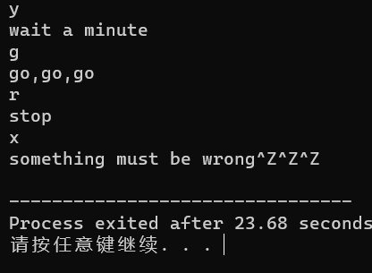 1 #include<stdlib.h> 2 3 int main() 4 { 5 char color; 6 7 while(scanf("%c",&color)!=EOF) 8 { 9 if (color>='a'&&color<='z') 10 { 11 if (color=='r') 12 printf("stop\n"); 13 else if (color=='g') 14 printf("go,go,go\n"); 15 else if (color=='y') 16 printf("wait a minute\n"); 17 else 18 printf("something must be wrong"); 19 } 20 21 } 22 return 0; 23 }