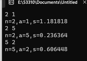 1 include<stdio.h> 2 #include<stdlib.h> 3 int main() 4 { 5 int n, a; 6 int i; 7 double s = 0; 8 9 while (scanf("%d%d", &n, &a) != EOF) { 10 int l = 1; 11 double sum = 0; 12 for (i = 1; i <= n; i++) { 13 s = (i * 1.0) / (a * l * 1.0); 14 sum = sum + s; 15 l = l * 10 + 1; 16 } 17 18 printf("n=%d,a=%d,s=%lf\n", n, a, sum); 19 } 20 return 0; 21 }