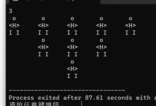 1 #include<stdio.h> 2 3 int main() 4 { 5 int n; 6 scanf("%d", &n); 7 int n1 = n; 8 int s; 9 int space; 10 11 for (n = n; n > 0; n--) { 12 for (space = n1 - n; space > 0; space--) { 13 printf("\t"); 14 } 15 for (s = 2 * n - 1; s > 0; s--) { 16 printf(" o\t"); 17 } 18 printf("\n"); 19 20 21 for (space = n1 - n; space > 0; space--) { 22 printf("\t"); 23 } 24 for (s = 2 * n - 1; s > 0; s--) { 25 printf("<H>\t"); 26 } 27 printf("\n"); 28 29 30 for (space = n1 - n; space > 0; space--) { 31 printf("\t"); 32 } 33 for (s = 2 * n - 1; s > 0; s--) { 34 printf("I I\t"); 35 } 36 for (space = n1 - n; space > 0; space--) { 37 printf("\t"); 38 } 39 printf("\n"); 40 } 41 42 return 0; 43 }