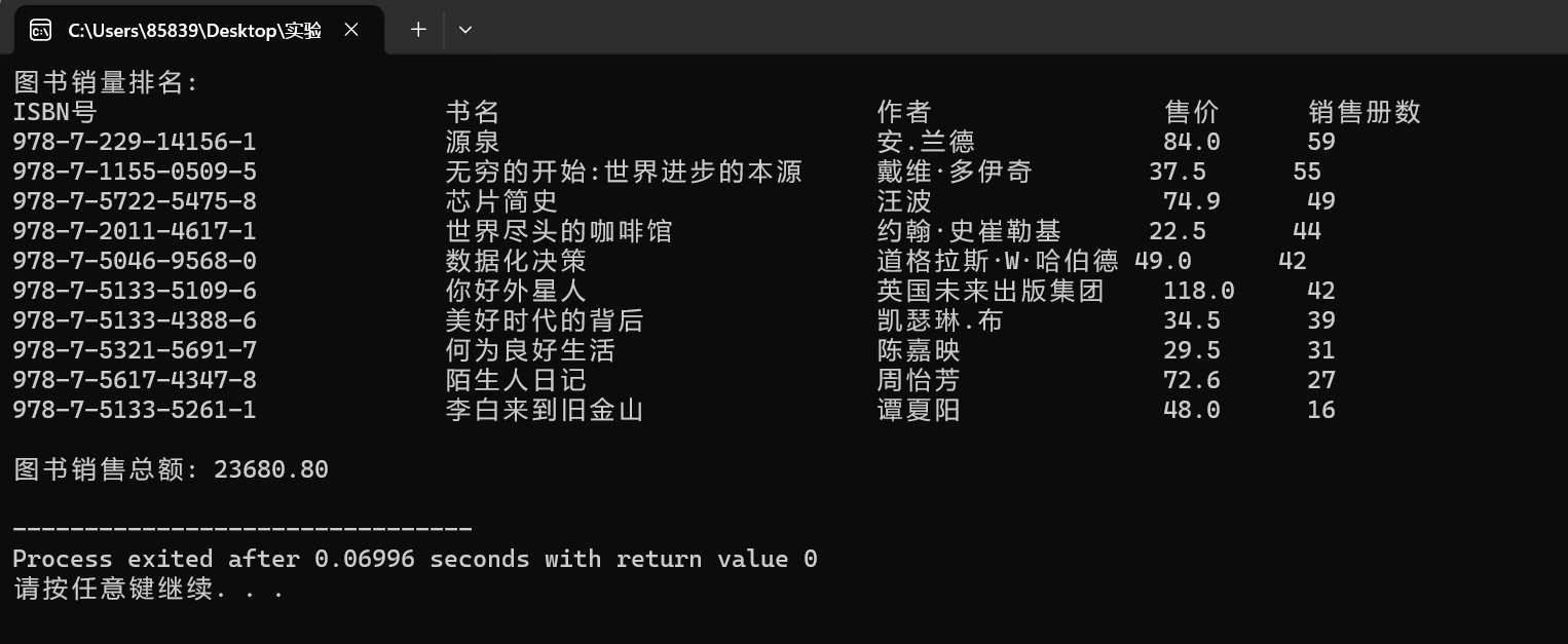 1 #include <stdio.h> 2 #define N 10 3 4 typedef struct { 5 char isbn[20]; // isbn号 6 char name[80]; // 书名 7 char author[80]; // 作者 8 double sales_price; // 售价 9 int sales_count; // 销售册数 10 } Book; 11 12 void output(Book x[], int n); 13 void sort(Book x[], int n); 14 double sales_amount(Book x[], int n); 15 16 int main() { 17 Book x[N] = {{"978-7-229-14156-1", "源泉", "安.兰德", 84, 59}, 18 {"978-7-5133-5261-1", "李白来到旧金山", "谭夏阳", 48, 16}, 19 {"978-7-5617-4347-8", "陌生人日记", "周怡芳", 72.6, 27}, 20 {"978-7-5722-5475-8", "芯片简史", "汪波", 74.9, 49}, 21 {"978-7-5046-9568-0", "数据化决策", "道格拉斯·W·哈伯德", 49, 42}, 22 {"978-7-5133-4388-6", "美好时代的背后", "凯瑟琳.布", 34.5, 39}, 23 {"978-7-1155-0509-5", "无穷的开始:世界进步的本源", "戴维·多伊奇", 37.5, 55}, 24 {"978-7-5321-5691-7", "何为良好生活", "陈嘉映", 29.5 , 31}, 25 {"978-7-5133-5109-6", "你好外星人", "英国未来出版集团", 118, 42}, 26 {"978-7-2011-4617-1", "世界尽头的咖啡馆", "约翰·史崔勒基", 22.5, 44}}; 27 28 printf("图书销量排名: \n"); 29 sort(x, N); 30 output(x, N); 31 32 printf("\n图书销售总额: %.2f\n", sales_amount(x, N)); 33 34 return 0; 35 } 36 37 // 待补足:函数output()实现 38 // ××× 39 void output(Book x[],int n){ 40 int i; 41 printf("isbn号 书名 作者 售价 销售册数\n"); 42 for(i=0;i<n;i++) 43 printf("%20s %20s %5s %.1f %d\n",x[i].isbn,x[i].name,x[i].author,x[i].sales_price,x[i].sales_count); 44 } 45 46 // 待补足:函数sort()实现 47 // ××× 48 void sort(Book x[],int n){ 49 int i, j; 50 Book t; 51 52 for(i = 0; i < n-1; i++) 53 for(j = 0; j < n-1-i; j++) 54 if(x[j].sales_count < x[j+1].sales_count) { 55 t = x[j]; 56 x[j] = x[j+1]; 57 x[j+1] = t; 58 } 59 } 60 61 // 待补足:函数sales_count()实现 62 // ××× 63 double sales_amount(Book x[],int n){ 64 int i,sum=0,s; 65 for(i=0;i<n;++i){ 66 s=(x[i].sales_price)*(x[i].sales_count); 67 sum+=s; 68 } 69 return sum; 70 }