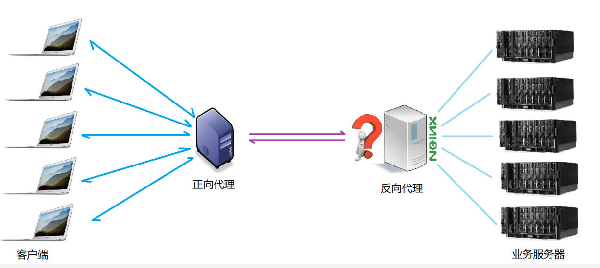 实际上,Proxy 在两种代理中做的事情都是替服务器代为收发请求和响应,不过从结构上看正好左右互换了一下,所以把后出现的那种代理方式称为反向代理了。