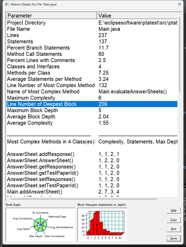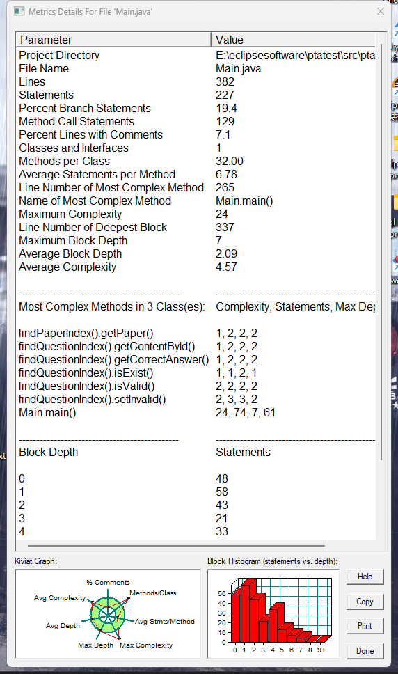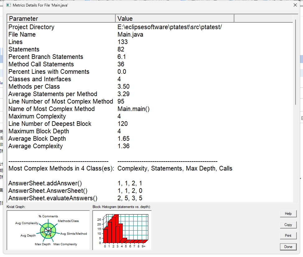 在单信息输入的情况下,应该直接输出格式错误的提示信息,但是我一直输出的是试卷不存在的信息,我认为应该是我的输出逻辑有问题。但是我修改完后能直接输出格式错误的提示信息了,就不能正确输出输出的是试卷不存在的信息了,导致两边都不行。其他的测试点没有通过大部分是我的异常处理的逻辑问题,不能输出正确的提示信息。在我设计代码的时候没有考虑周全,使用了不合适的数据结构来存储数据。还有类之间的关系以及引用太混乱,导致我的思路非常乱,造成了这个后果。在我的答题程序3的sourcemonitor生产报表中,可以看到我的Main类中复杂度非常的高,这很容易导致维护的困难和逻辑的错误。我在答题程序2中的Main类中也写了很多代码。这是我以后应该要多加注意的地方,不要在Main类里面写太多代码,造成读起来不畅并且写起来思路也不清晰的后果。