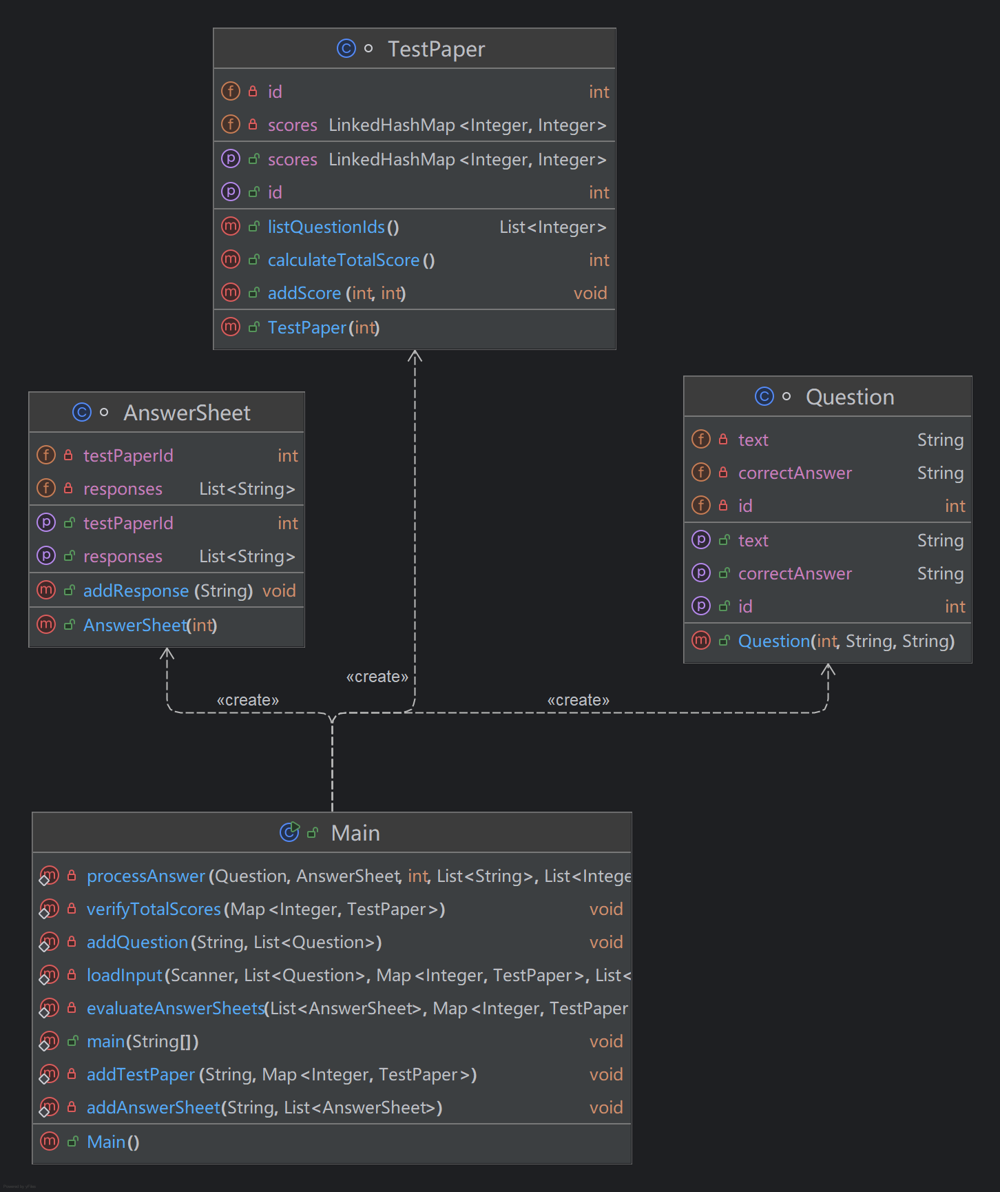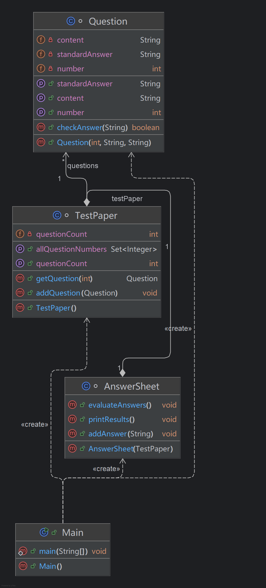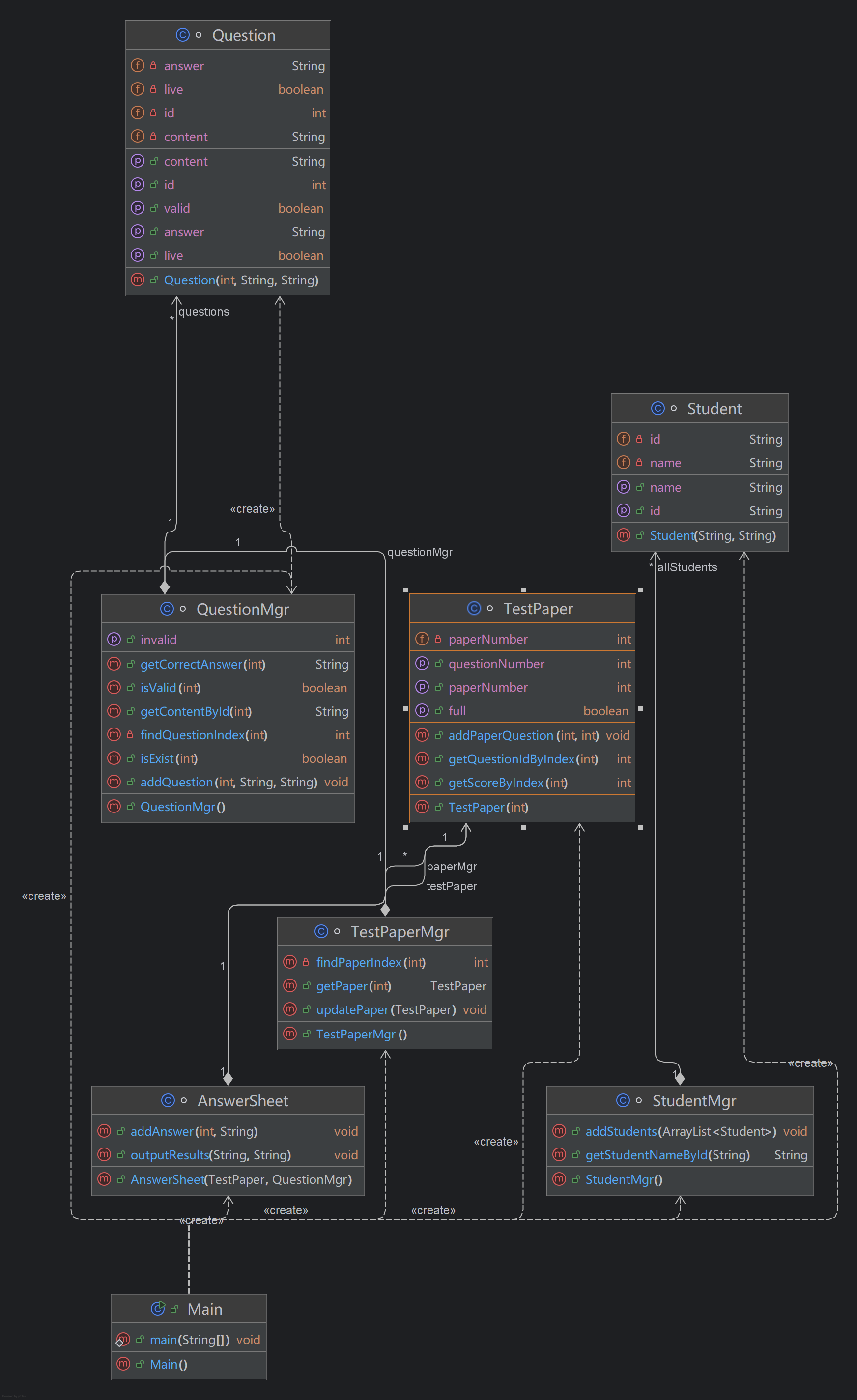 总体上来说就是Question 处理问题信息,TestPaper 管理试卷及其分数,AnswerSheet 记录学生的答案,而 Main 控制整个流程。