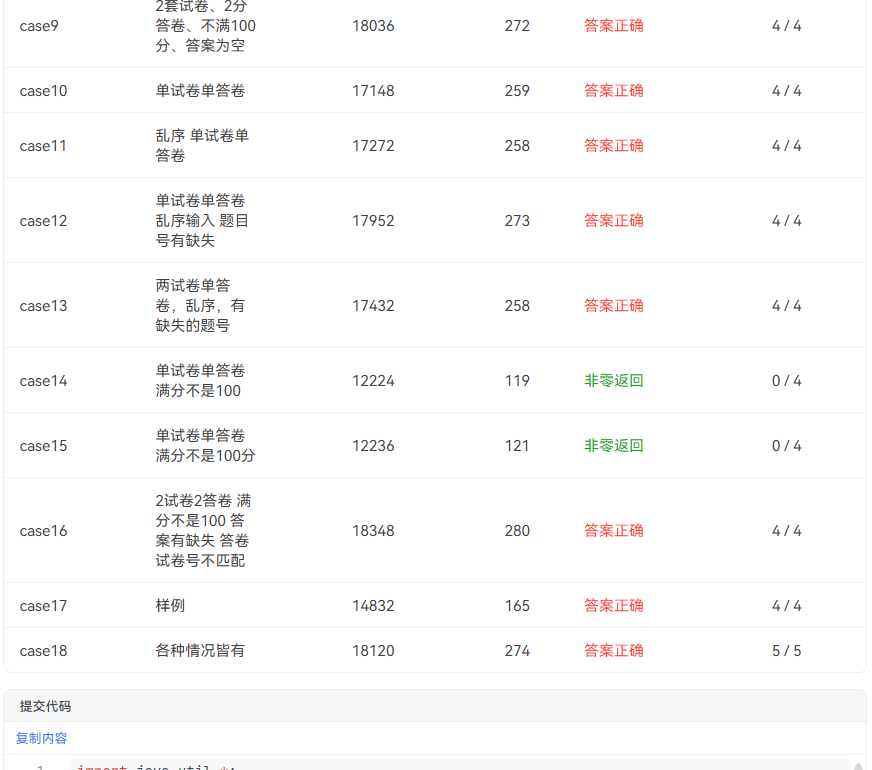 7-4 答题判题程序2:在答题判题程序1的基础上加深正则表达式的应用,并且引入了试卷信息的输入,此外还增加了乱序输入的情况,这就要求必须要存储到合适的数据结构中如ArrayList或者HashMap来进行判断了。程序在逻辑判断,格式判断,错误处理上更加严格、复杂了,必须加以小心。