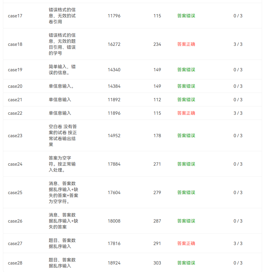 8、在确认学生存在后,按格式输出总答卷成绩,包括每道题的得分、总分以及正确和错误的题目数量等信息。