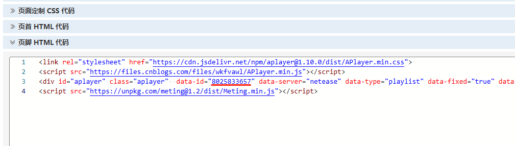 将以下代码添加到页脚代码中, 第三排data-id="XXXX" xxxx换成网易云歌单地址中id即可
