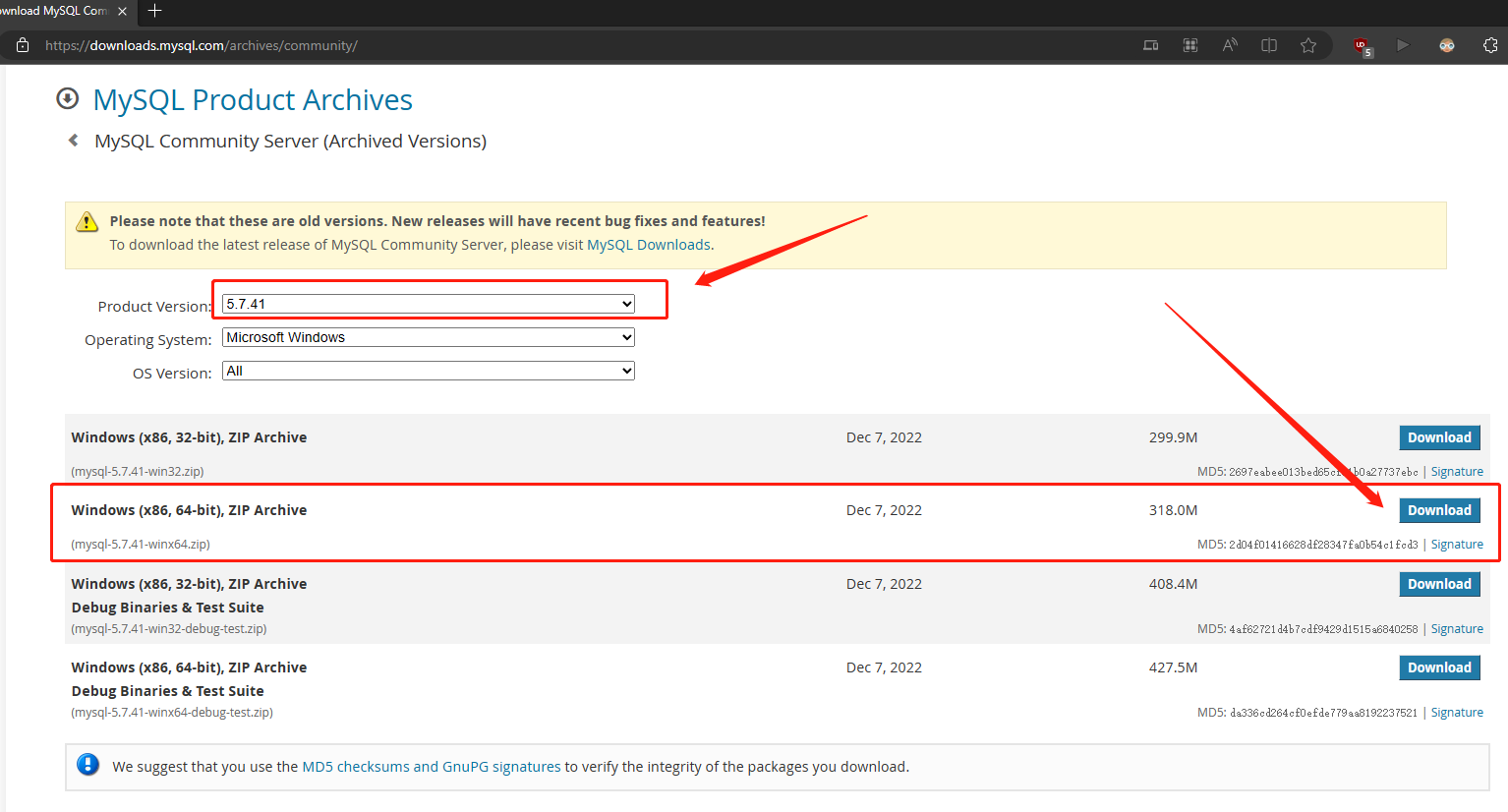 然后选择MySQL版本为5.7,然后选x86平台64位版本下载压缩包