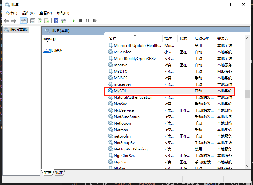 在服务列表中找到MySQL服务鼠标右键可以手动管理服务