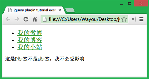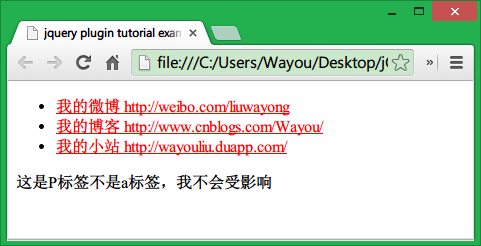 现在就可以去页面试试我们的代码了,在页面上放几个链接,调用插件后链接字体变成红色。