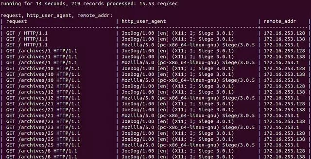 $ tail -f /var/log/apache2/access.log | ngxtop -f common