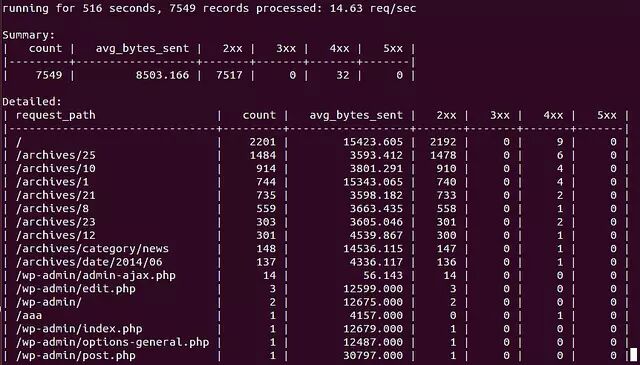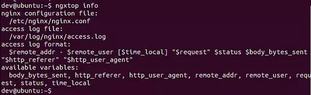 如果你不需要以上软件提供的综合性报告或者长期数据统计功能,只是需要一种快速简便的办法去监控 Nginx 服务器的请求的话,我建议你采用一个叫 ngxtop 的命令行工具。