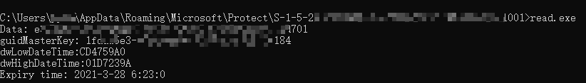 存放密钥的文件则被称之为 Master Key Files,其路径一般为 %APPDATA%/Microsoft/Protect/%SID% 。而这个文件中的密钥实际上是随机 64 位字节码经过用户密码等信息的加密后的密文,所以只需要有用户的明文密码 / Ntlm/Sha1 就可以还原了。