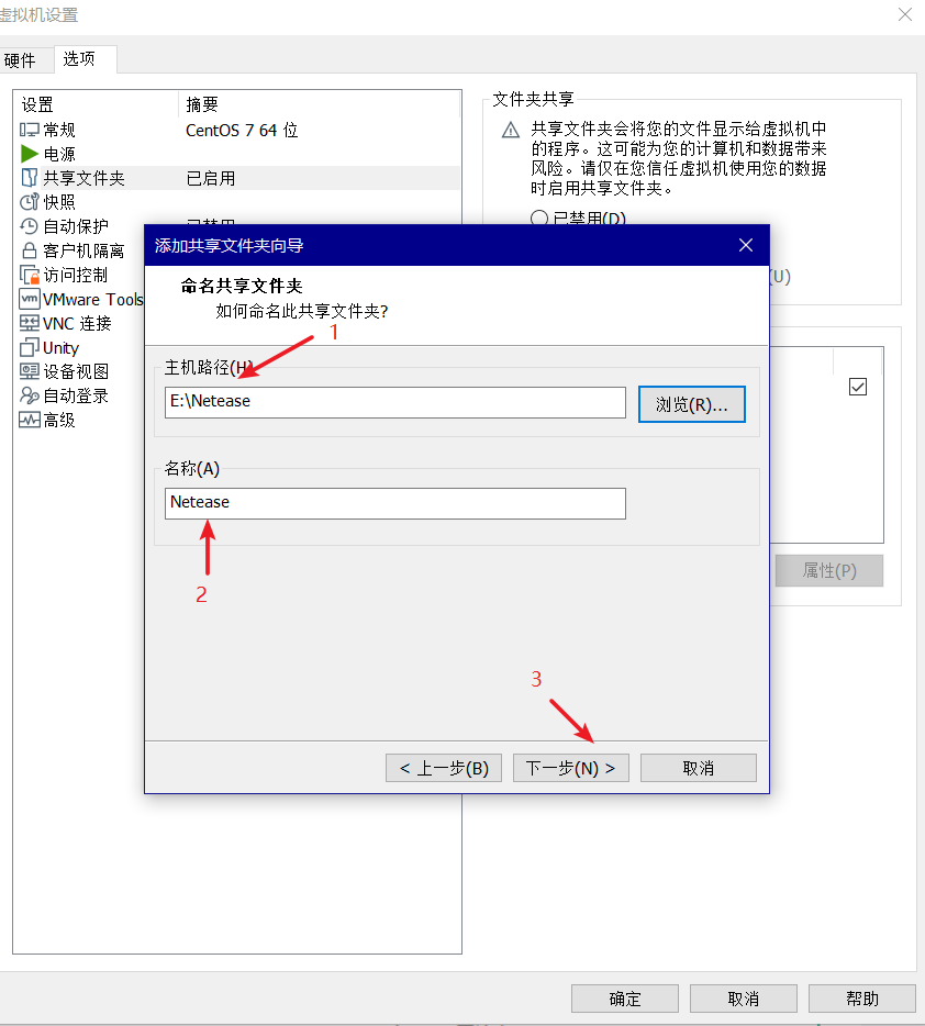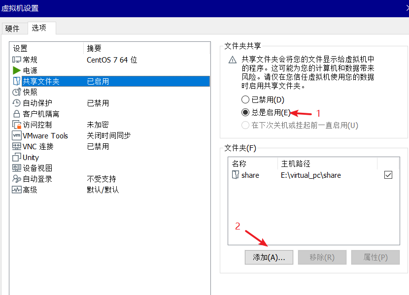 选项-共享文件夹,设置主机需要共享的文件夹路径