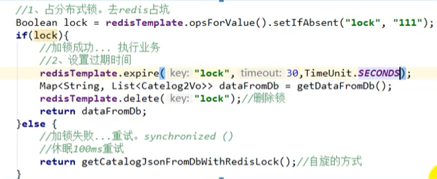如果执行业务时出现异常,没有释放锁,则会出现死锁问题,考虑trycatch,但是若机器断电或其它问题,则还是死锁。故应该设置过期时间