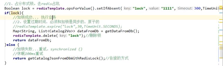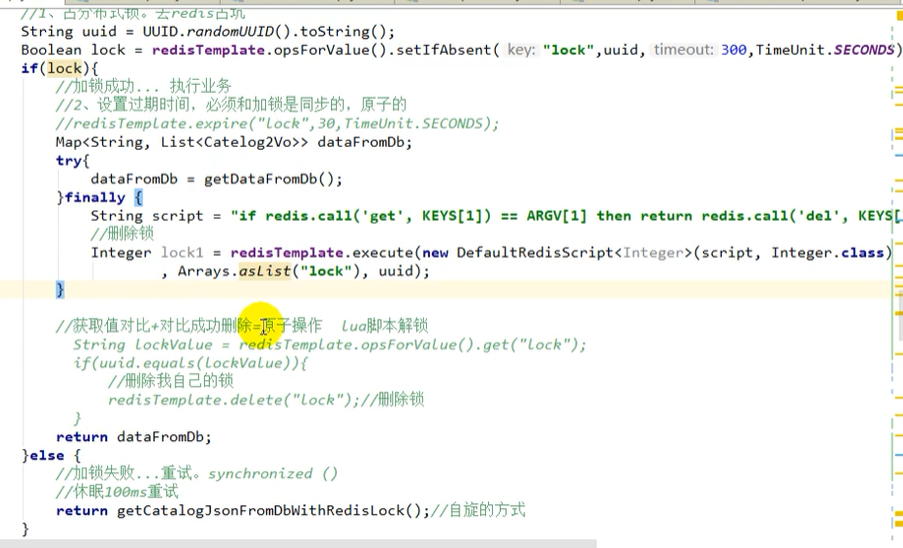 此时若设置锁后,还没设置失效时间时,电脑断电了,依然死锁。需要将获取锁和设置过期时间更改为原子操作