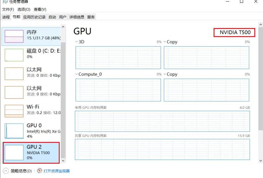 先看看本地有无nvidia的显卡,通过任务管理器查看,本机是有的了