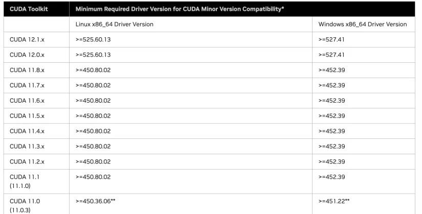 CUDA与驱动版本关系:https://docs.nvidia.com/cuda/cuda-toolkit-release-notes/index.html