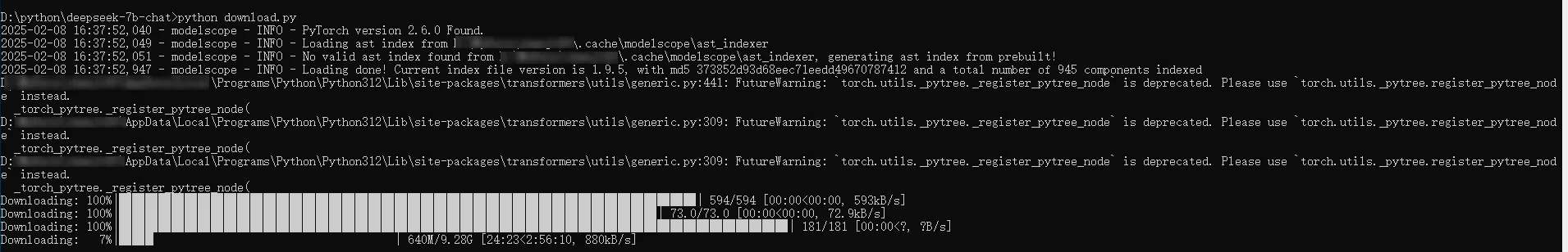 import torch from modelscope import snapshot_download, AutoModel, AutoTokenizer from modelscope import GenerationConfig model_dir = snapshot_download('deepseek-ai/deepseek-llm-7b-chat', cache_dir='D:/python/deepseek-7b-chat', revision='master')