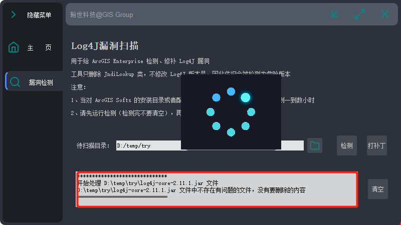 2、Log4j工具会对选择的目录进行遍历查找,文件夹越大耗时越长。目前测试对 ArcGIS Portal 安装目录进行扫描需要耗时近一小时(具体时间视机器性能而异)
