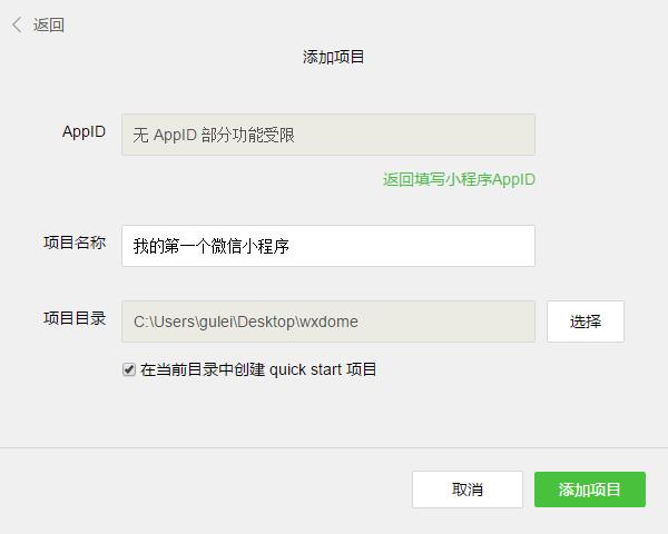 2、创建项目应用:安装完成后,打开并扫码登录。小程序发布需要企业级的认证公众号,所以个人订阅号是不能发布的。所以我这里选择无AppID,创建项目选择一个本地空文件夹,勾选创建quick start 项目生成一个demo。
