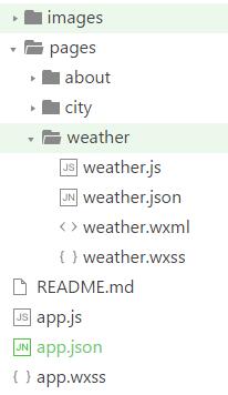 在原先pages文件夹中,删除index和log页面文件夹,新建weather、city、about三个页面文件夹,及三个页面对应的四个文件类型,文件结构如下图